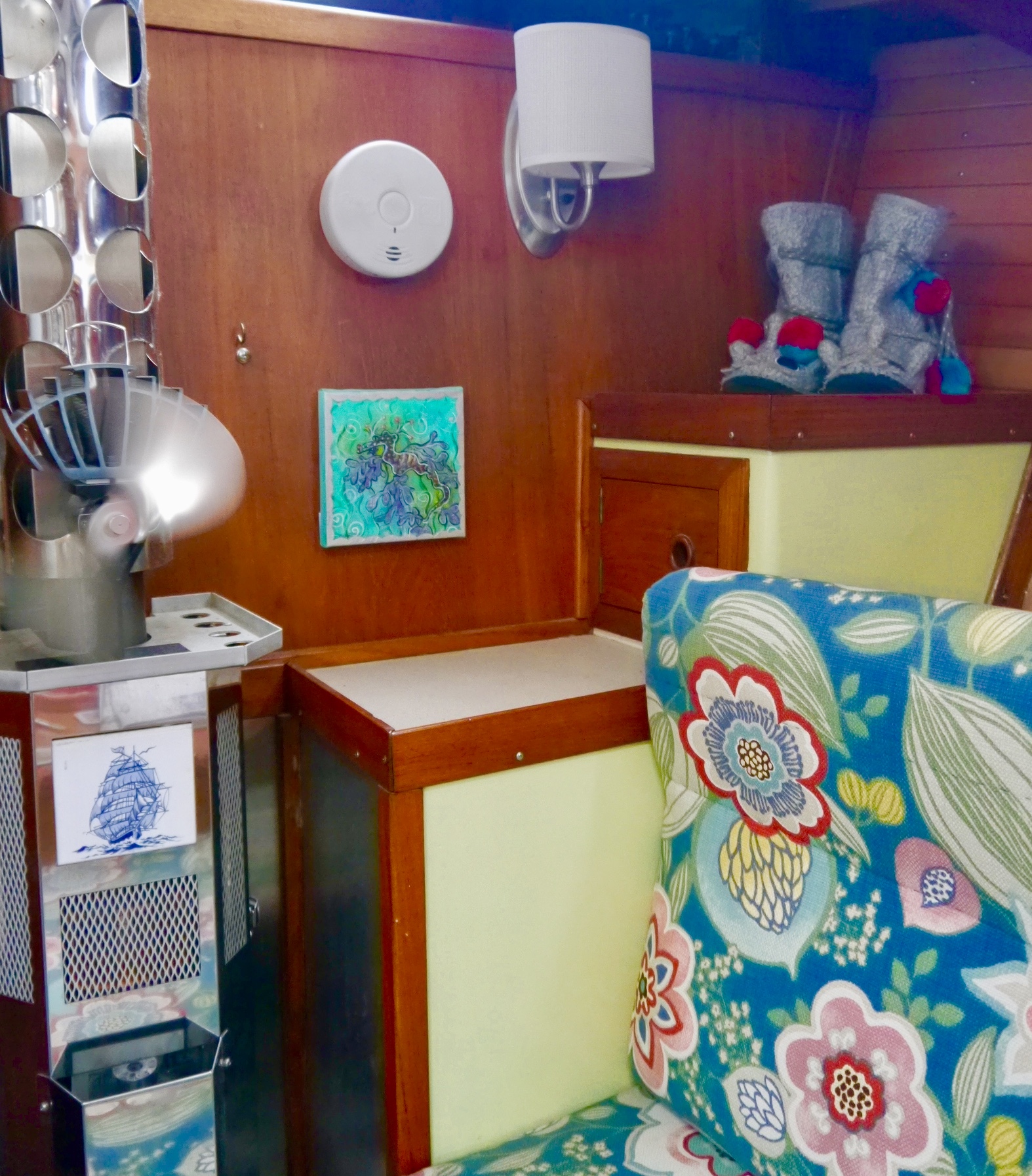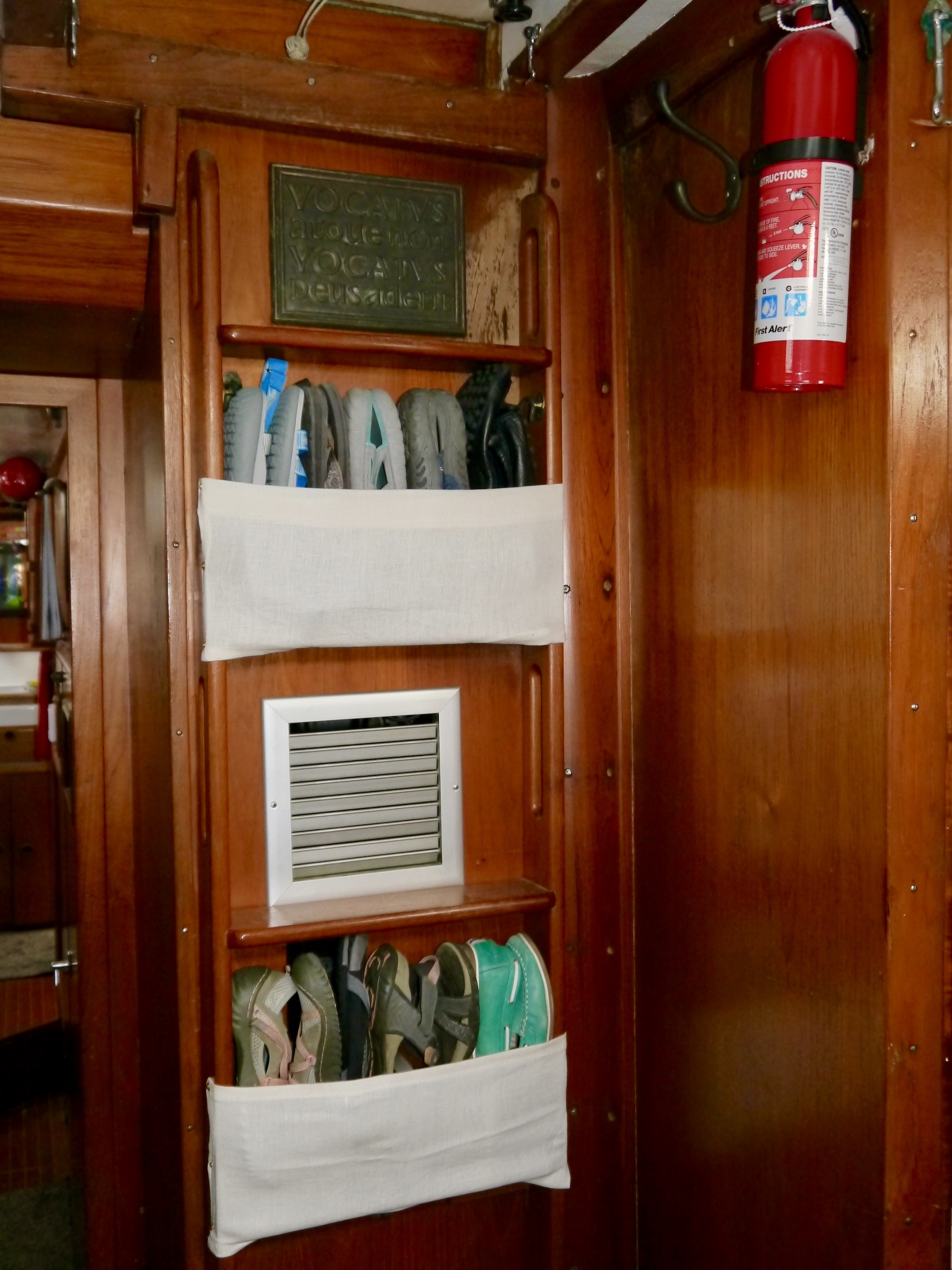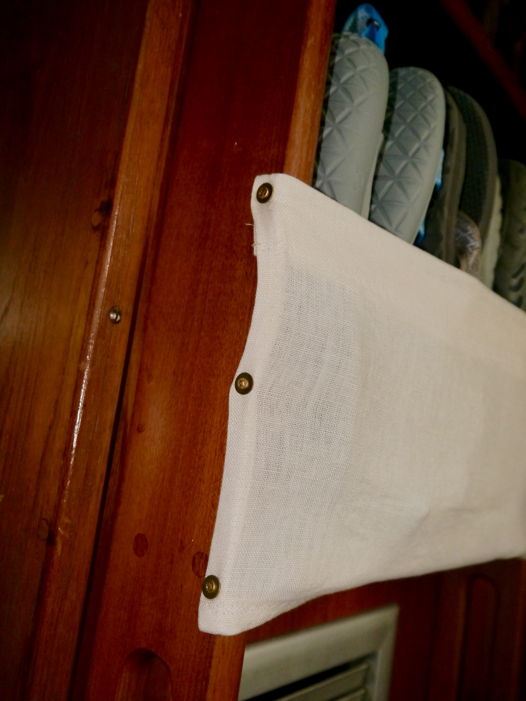 I knew what the real problem was. It was jealously. You see, I had created these cool little niches in which to stack sandals upright, using the spaces created by the ladder against the bulkhead in the aft cabin. (It’s impossible to use that ladder. It is narrow and goes straight up. You need the adrenaline of an actual emergency to use it. For that purpose, it will continue to serve.) He wanted one of those spaces, and I willingly, out of the generousness of my heart, gave it to him for his shoes.
