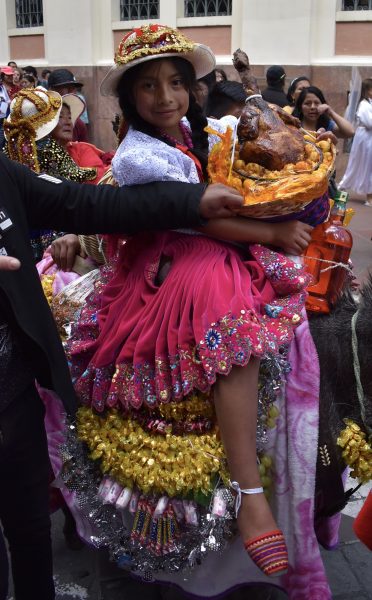Horses dressed in decked out saddle blankets filled the streets, carrying children dressed up as characters from the Christmas story or simply dressed in sequined finery. There were a few Santas, which is a recent phenomenon here. The blankets are covered with all kinds of food and drink, and often there will be a basket attached to the back of the saddle carrying a roasted pig and roasted guinea pigs. (Culturally, that one was a bit hard. I used to have those as pets.)