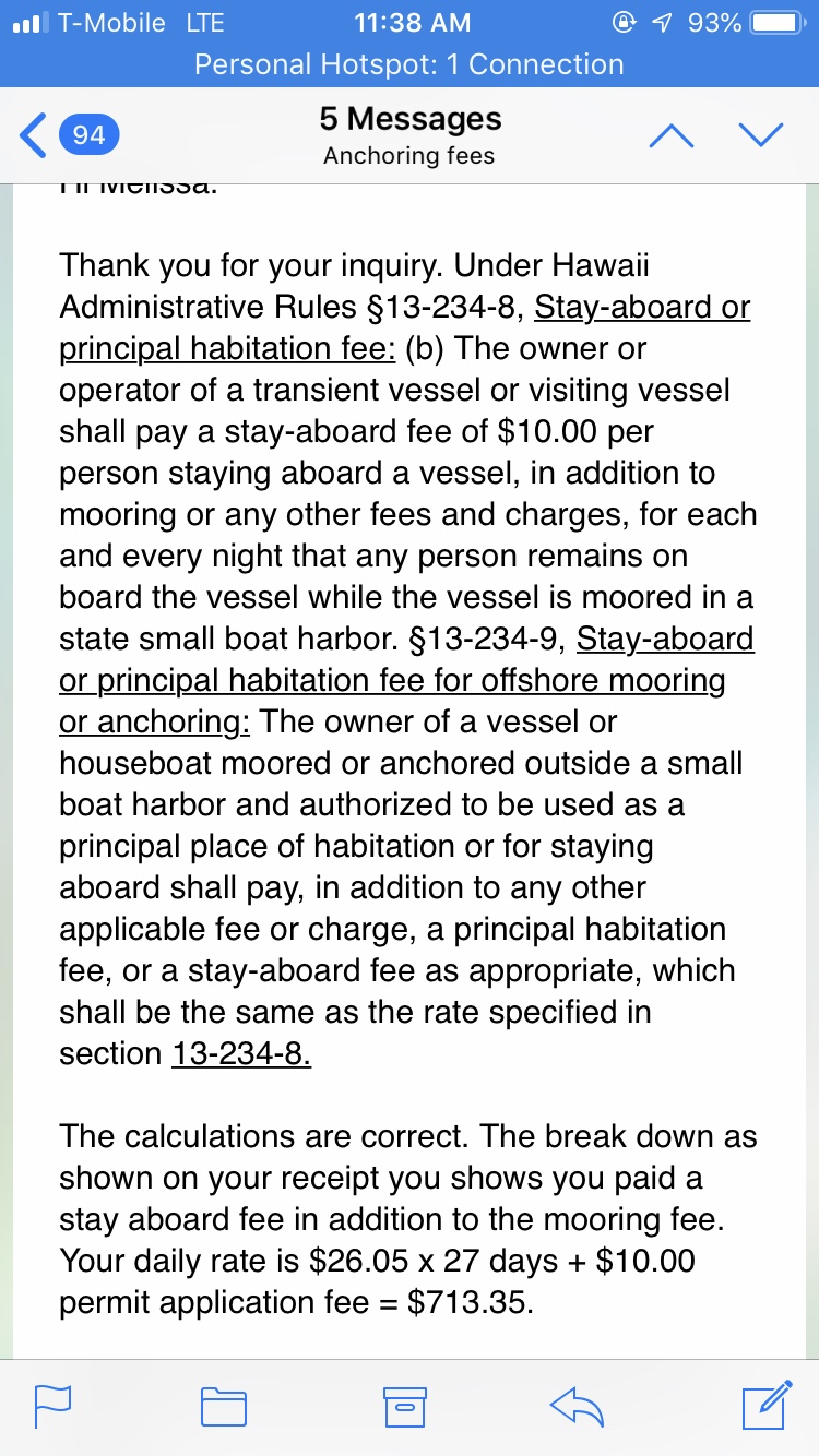 Didn’t we research this before we came? Well, yes, I did. I went to this website. And I found that Hawaii had increased the rates to moor at marinas because their state marinas were in poor repair. But we would not be staying in a marina, we would be anchoring. And I could not find anything specific to that. I never imagined that we would be charged what looks like the same rates as people in state marinas. It’s almost like they don’t want you to cruise to the islands and anchor out. You think?